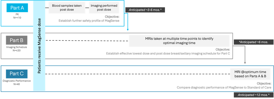 Designed in three parts, the study will start with an initial cohort of subjects to collect additional safety data (Part A), as requested by the US Food and Drug Administration (FDA). The reduced dosing regimen and optimised imaging protocol will then be evaluated in a second group of subjects (Part B) before proceeding to a larger cohort of subjects to establish diagnostic performance (Part C). The MagSense® Phase 2 Clinical Trial for HER2 Breast Cancer is expected to be completed in 18-24 months following acceptance of the IND by the FDA. In addition to validating the diagnostic performance of MagSense® for HER2+ breast cancer, the results of the Phase 2 study will provide valuable insight into the potential impact on cost of care, patient outcomes, and overall clinical value. Additionally, by integrating quantitative imaging techniques into the study protocol, the Phase 2 will yield critical data for the development and training of AI diagnostic tools.